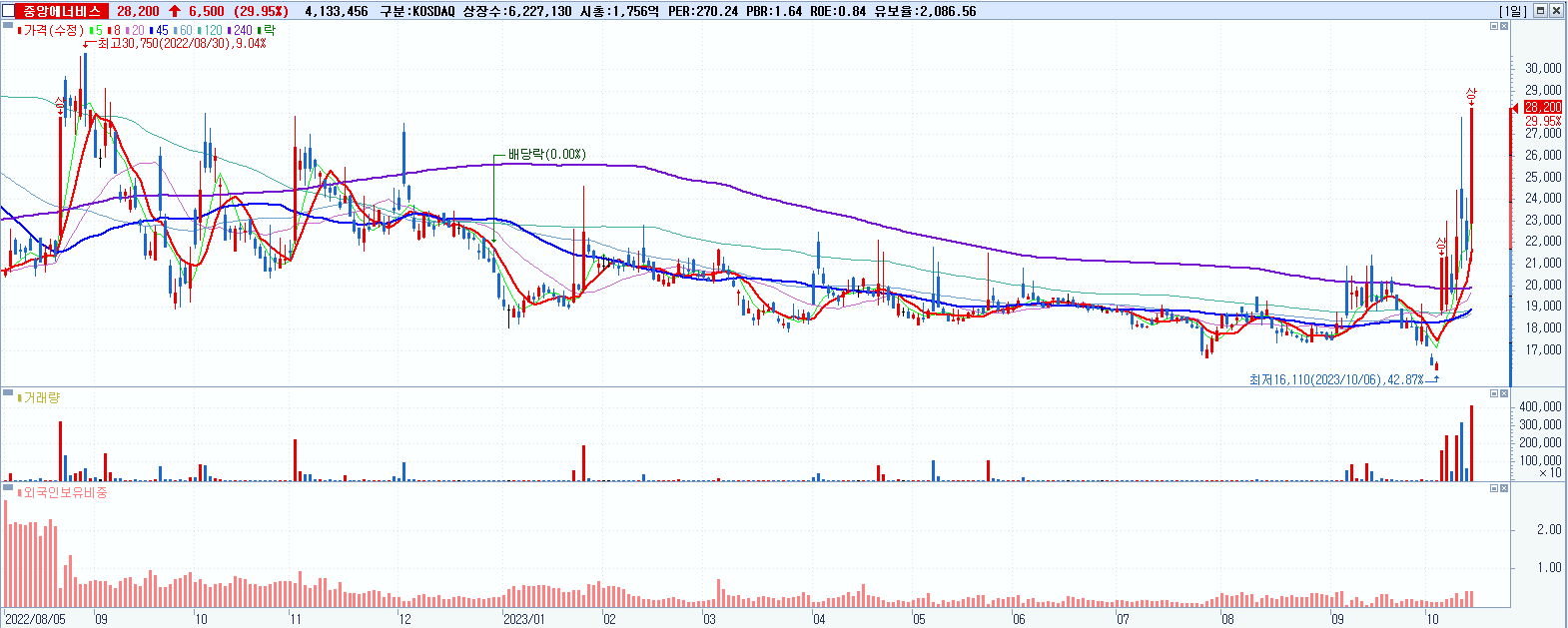 - 중앙에너비스 (28,200원 ▲ 29.95% , 시총: 1,756억, 거래량: 4,135,051, 거래대금:1,068억, KOSDAQ)