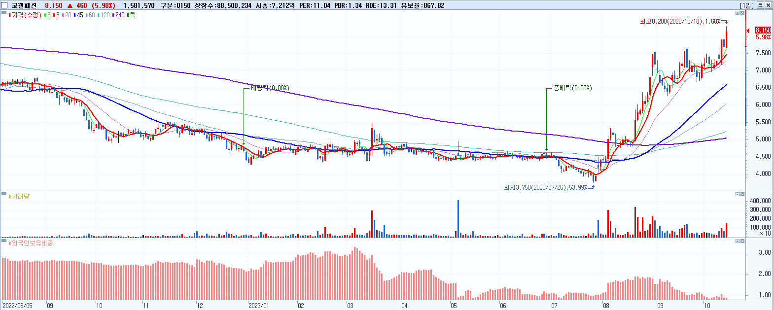 - 코웰패션 (8,150원 ▲ 5.98% , 시총: 7,213억, 거래량: 1,582,958, 거래대금:128억, KOSDAQ)