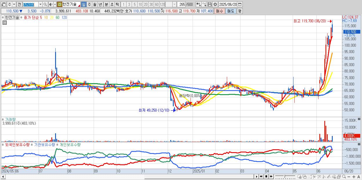 - 한전기술 (111,300원 ▼ -2.37% , 시총: 42,539억, 거래량: 2,025,008, 거래대금:2,248억)