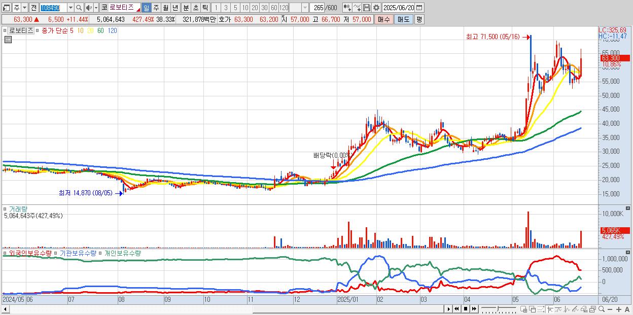 - 로보티즈 (63,000원 ▲ 10.92% , 시총: 8,324억, 거래량: 2,844,036, 거래대금:1,809억)