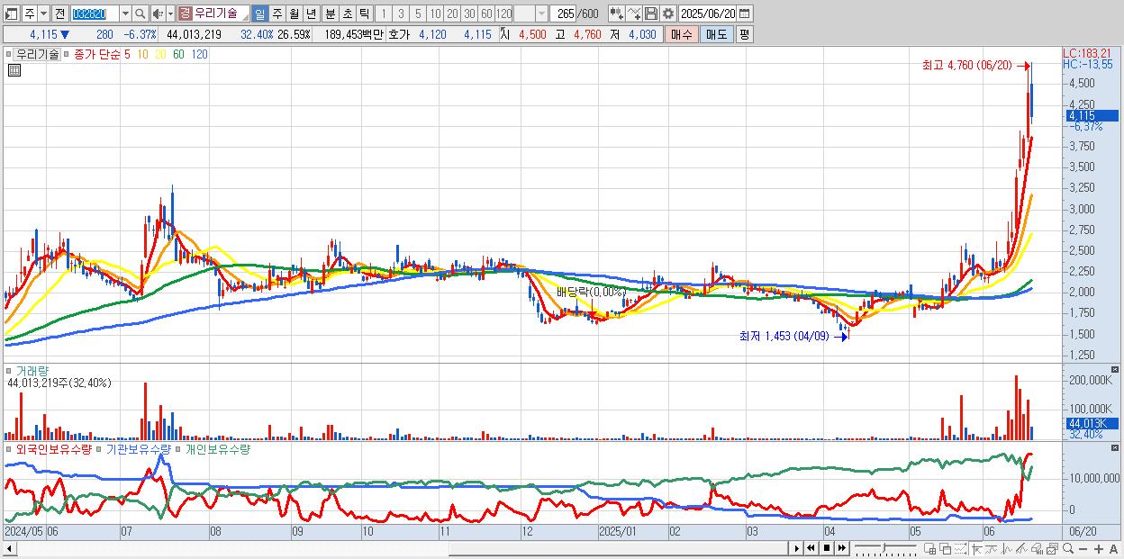 - 우리기술 (4,115원 ▼ -6.37% , 시총: 6,812억, 거래량: 44,013,219, 거래대금:1,895억)
