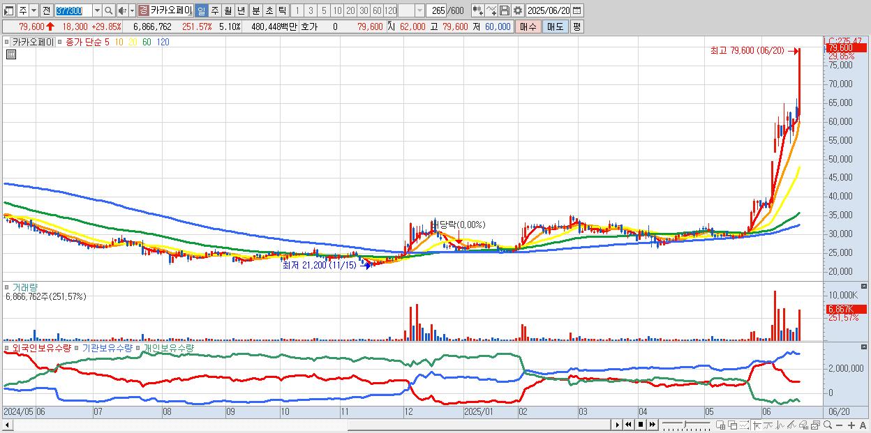 - 카카오페이 (79,600원 ▲ 29.85% , 시총: 107,219억, 거래량: 6,866,762, 거래대금:4,804억)