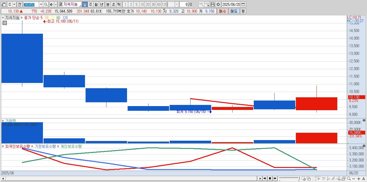 - 지씨지놈 (10,130원 ▲ 8.23% , 시총: 2,396억, 거래량: 15,044,589, 거래대금:1,557억)