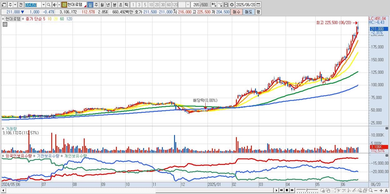 - 현대로템 (212,000원 0% , 시총: 231,382억, 거래량: 2,063,225, 거래대금:4,368억)