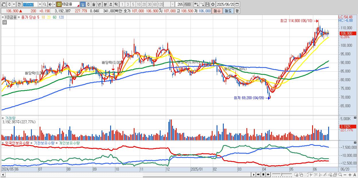 - KB금융 (106,500원 ▼ -0.19% , 시총: 406,257억, 거래량: 3,095,365, 거래대금:3,306억)