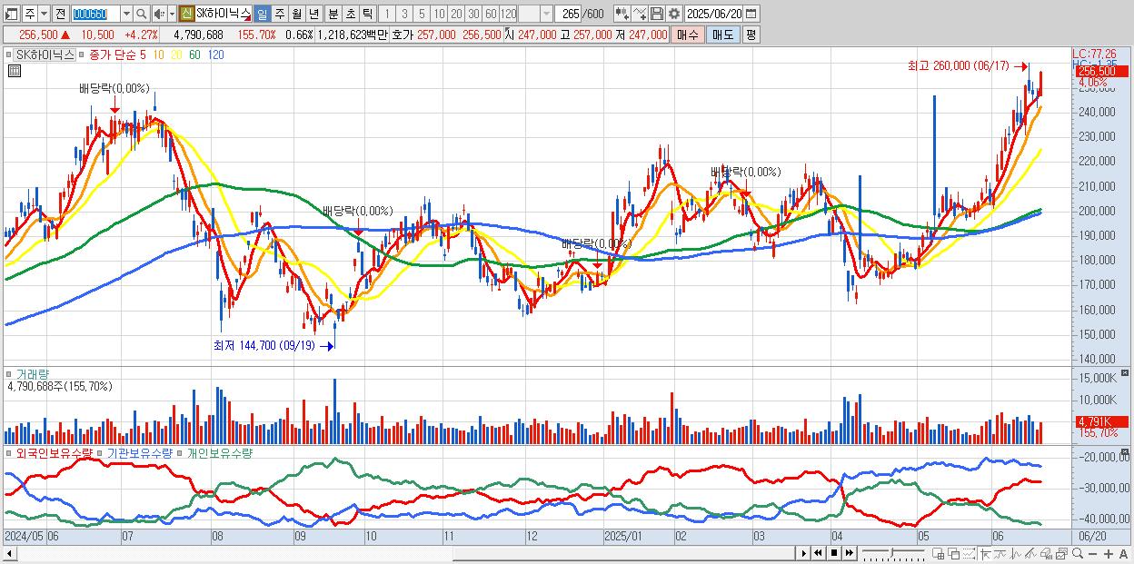- SK하이닉스 (257,000원 ▲ 4.47% , 시총: 1,870,966억, 거래량: 3,597,877, 거래대금:9,161억)