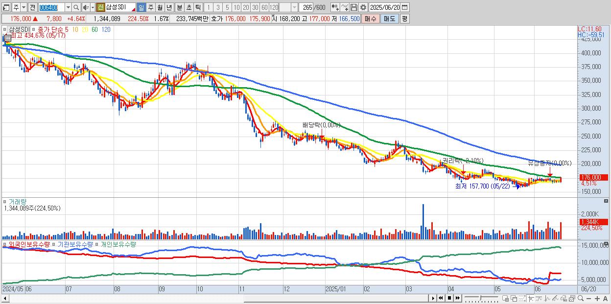 - 삼성SDI (176,300원 ▲ 4.82% , 시총: 142,072억, 거래량: 934,905, 거래대금:1,627억)