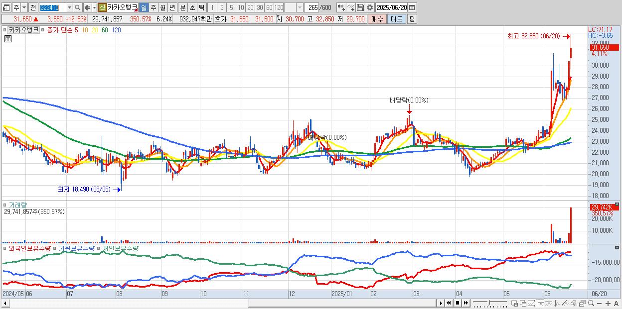 - 카카오뱅크 (32,050원 ▲ 14.06% , 시총: 152,875억, 거래량: 11,125,353, 거래대금:3,467억)