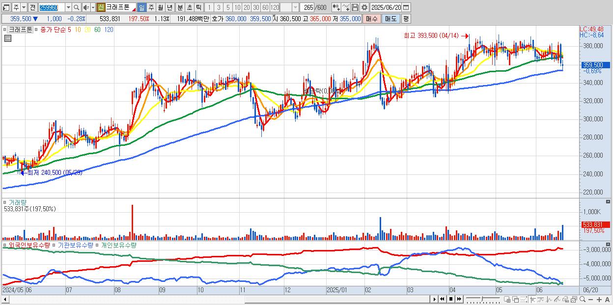 - 크래프톤 (358,000원 ▼ -0.69% , 시총: 169,651억, 거래량: 511,726, 거래대금:1,835억)