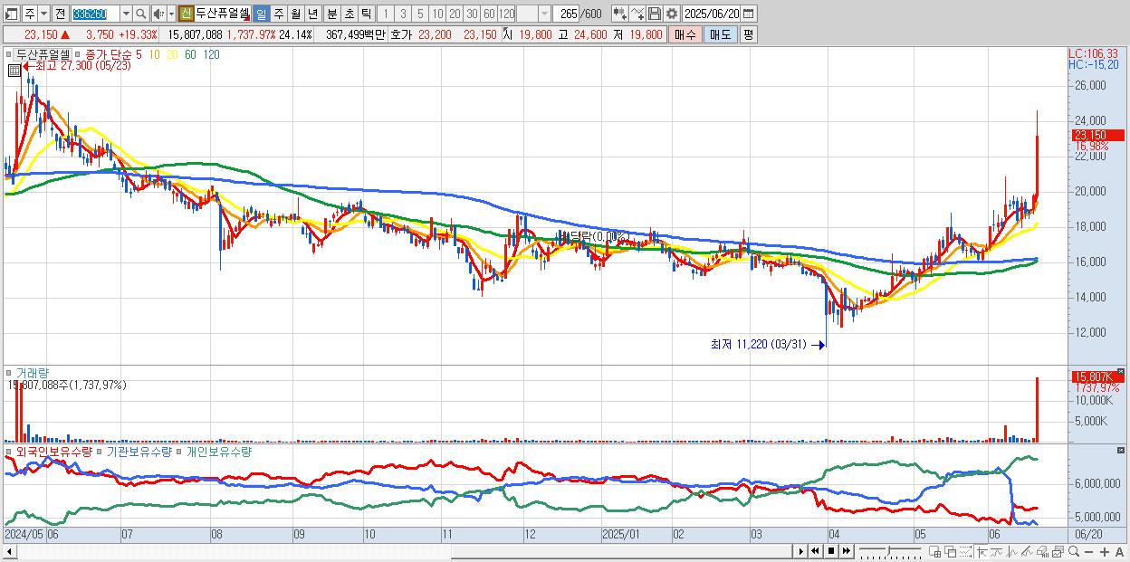 - 두산퓨얼셀 (23,450원 ▲ 20.88% , 시총: 15,358억, 거래량: 8,128,265, 거래대금:1,899억)