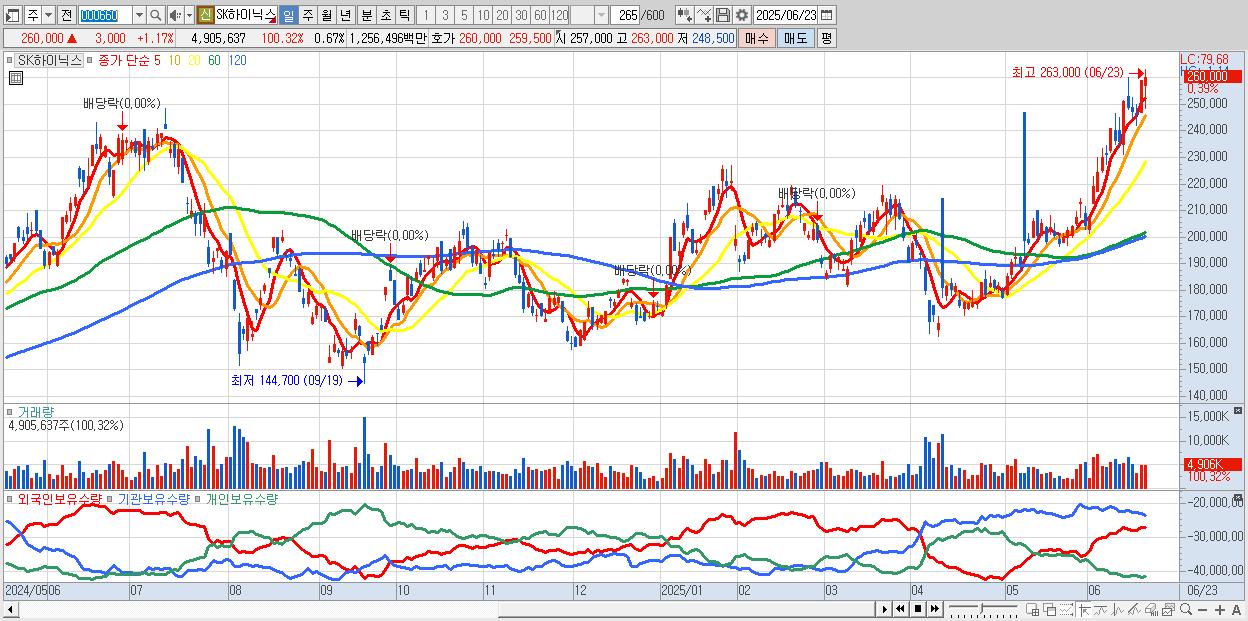 - SK하이닉스 (259,500원 ▲ 0.97% , 시총: 1,889,166억, 거래량: 3,398,736, 거래대금:8,715억)