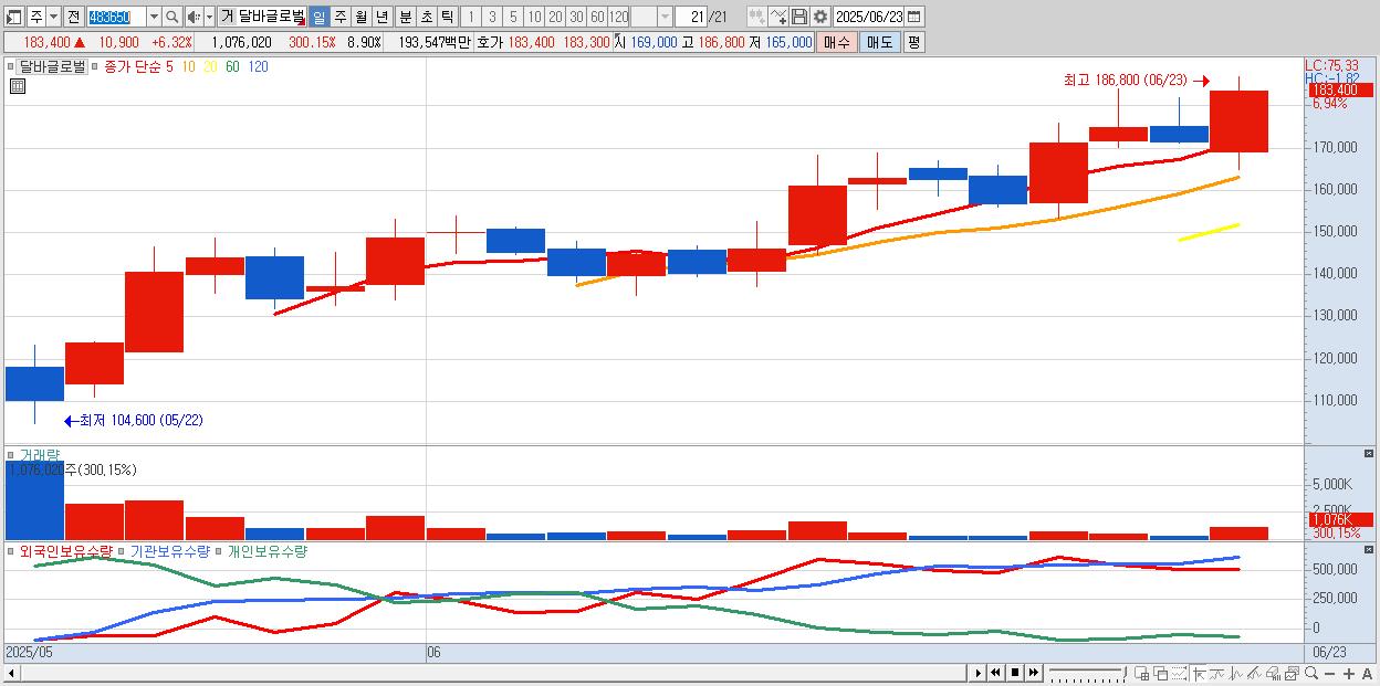 - 달바글로벌 (183,200원 ▲ 6.2% , 시총: 22,160억, 거래량: 814,599, 거래대금:1,465억)