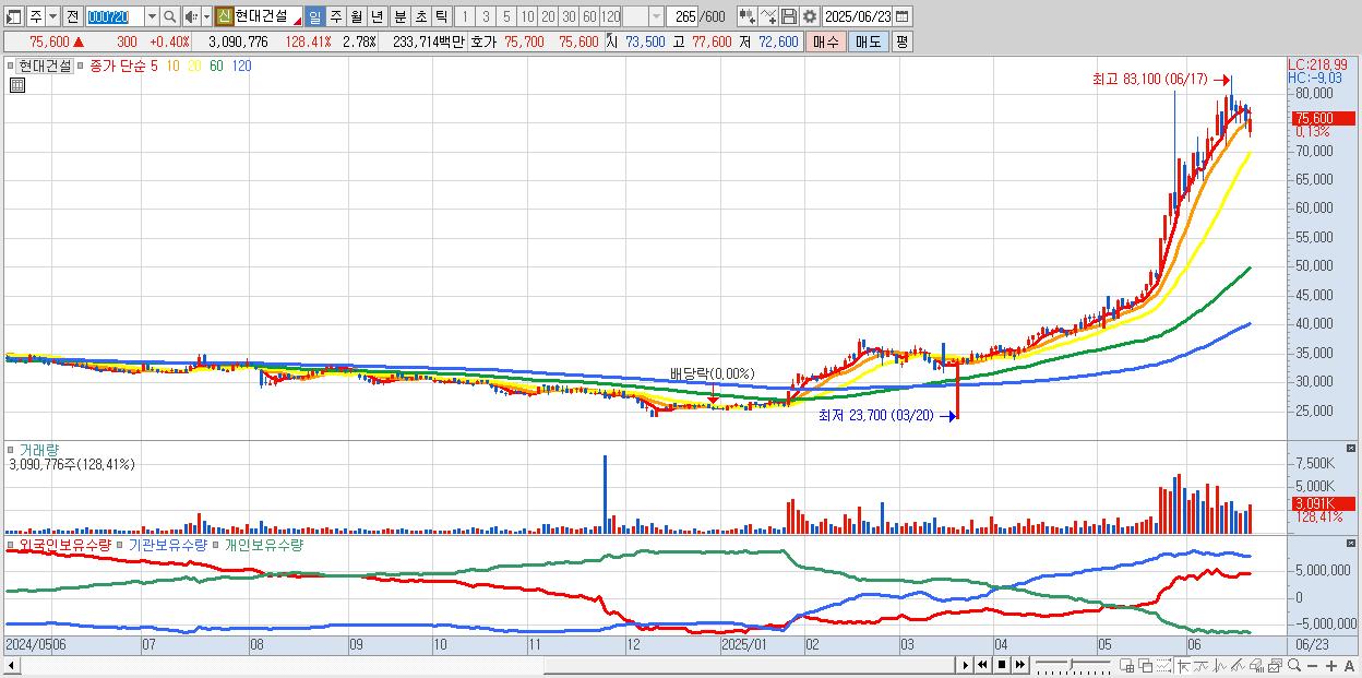 - 현대건설 (75,500원 ▲ 0.27% , 시총: 84,074억, 거래량: 2,042,571, 거래대금:1,547억)