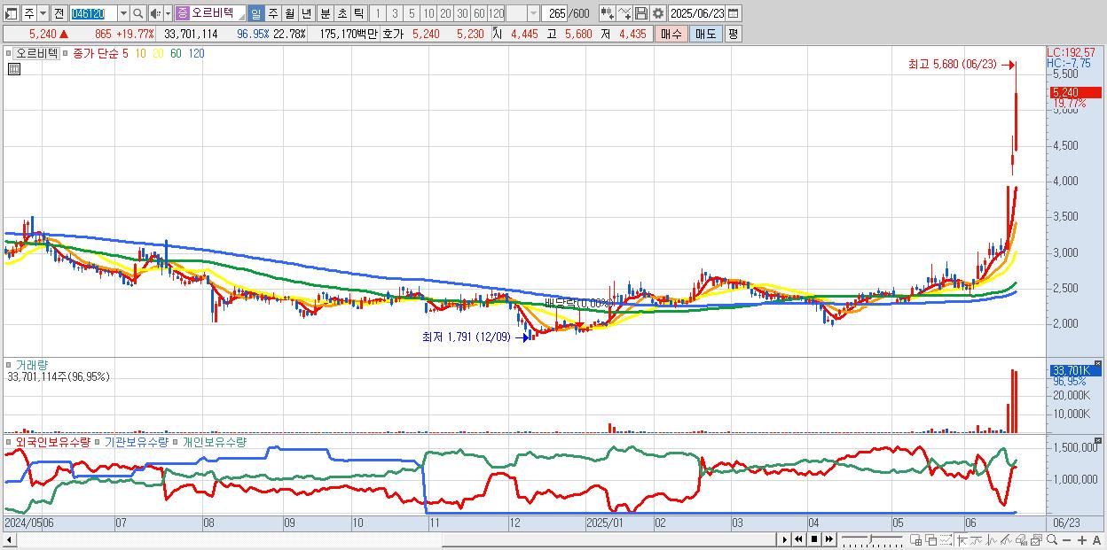 - 오르비텍 (5,240원 ▲ 19.77% , 시총: 1,438억, 거래량: 33,701,114, 거래대금:1,752억)