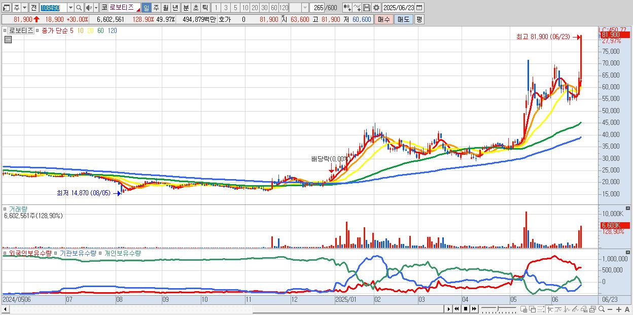 - 로보티즈 (81,900원 ▲ 30% , 시총: 10,822억, 거래량: 3,451,800, 거래대금:2,595억)