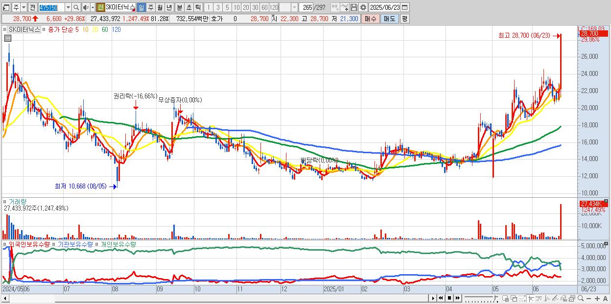 - SK이터닉스 (28,200원 ▲ 27.6% , 시총: 9,519억, 거래량: 12,613,170, 거래대금:3,393억)