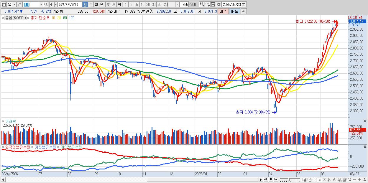 | 06/17 | 2,950.30 | ▲0.12% | 2,245억 | -953억 | -1,006억 | -286억 |