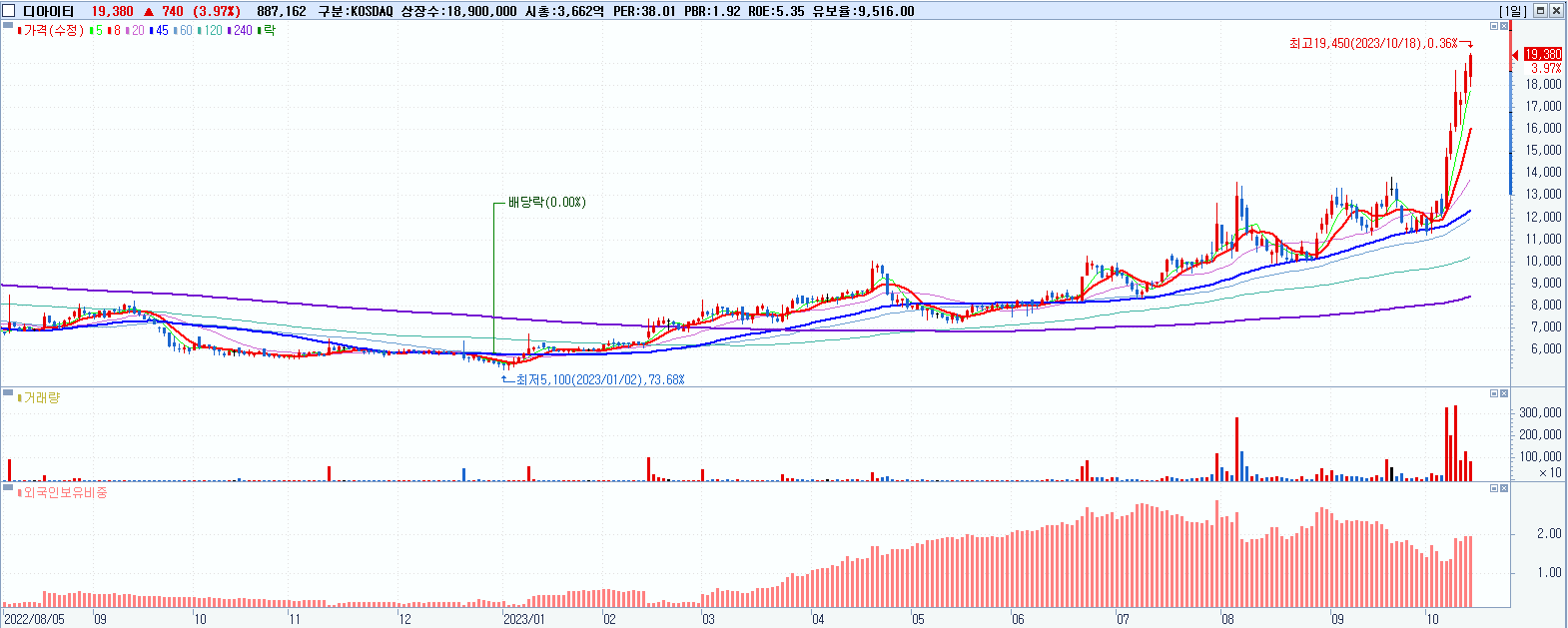 - 디아이티 (19,380원 ▲ 3.97% , 시총: 3,663억, 거래량: 887,305, 거래대금:168억, KOSDAQ)
