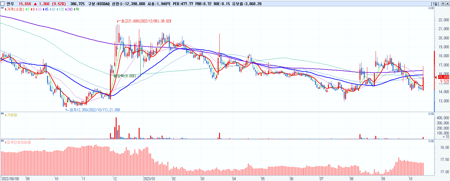 - 연우 (15,650원 ▲ 9.52% , 시총: 1,940억, 거래량: 386,868, 거래대금:61억)