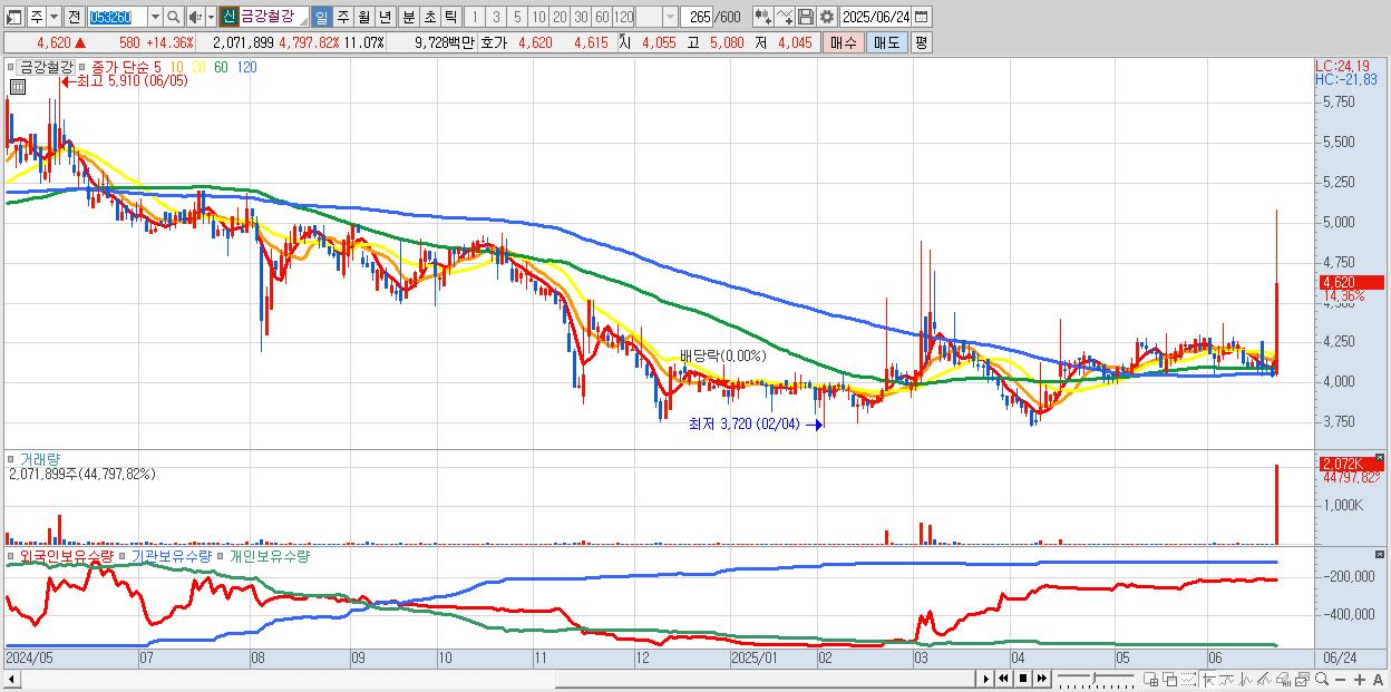 - 금강철강 (4,620원 ▲ 14.36% , 시총: 865억, 거래량: 2,071,899, 거래대금:97억)