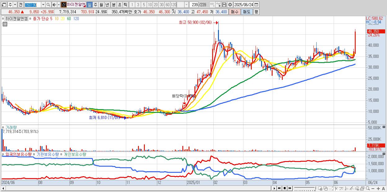 - 하이젠알앤엠 (45,950원 ▲ 25.89% , 시총: 14,193억, 거래량: 3,420,287, 거래대금:1,579억)