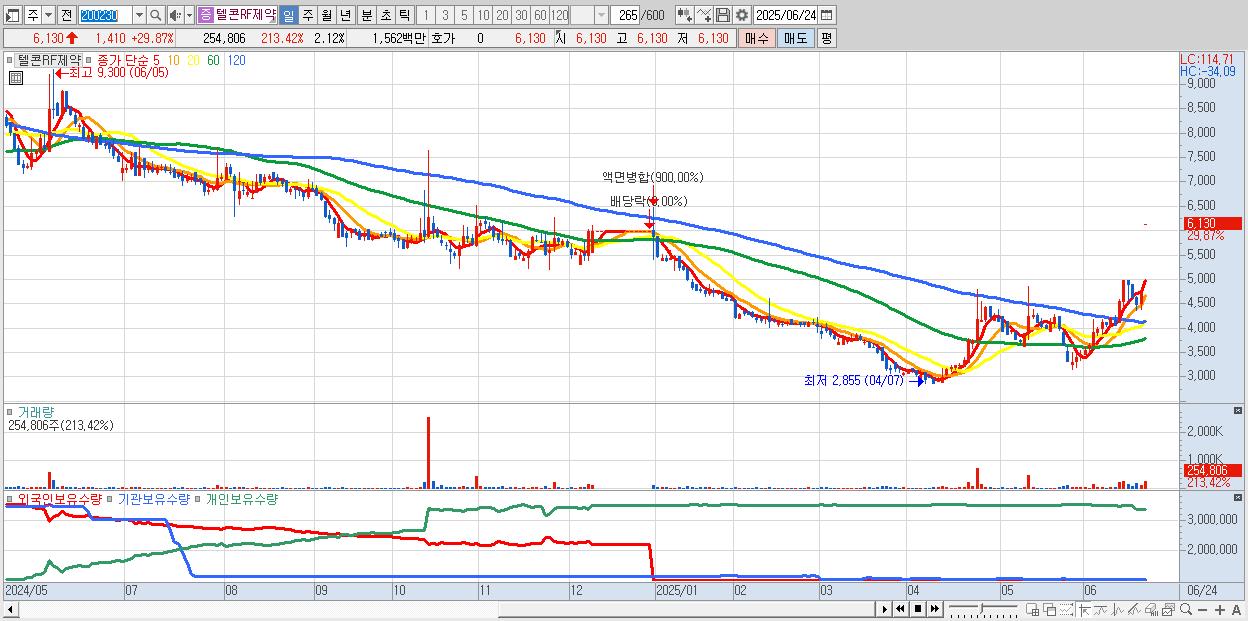 - 텔콘RF제약 (6,130원 ▲ 29.87% , 시총: 737억, 거래량: 254,806, 거래대금:16억)