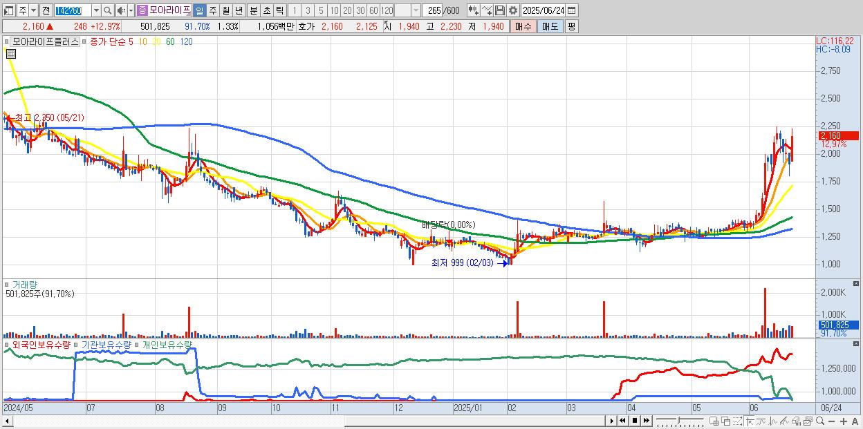 - 모아라이프플러스 (2,160원 ▲ 12.97% , 시총: 815억, 거래량: 501,825, 거래대금:11억)