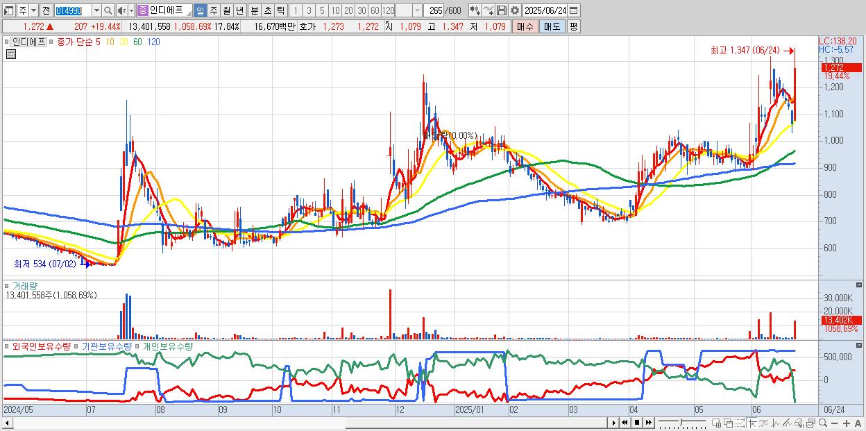 - 인디에프 (1,272원 ▲ 19.44% , 시총: 955억, 거래량: 13,401,558, 거래대금:167억)