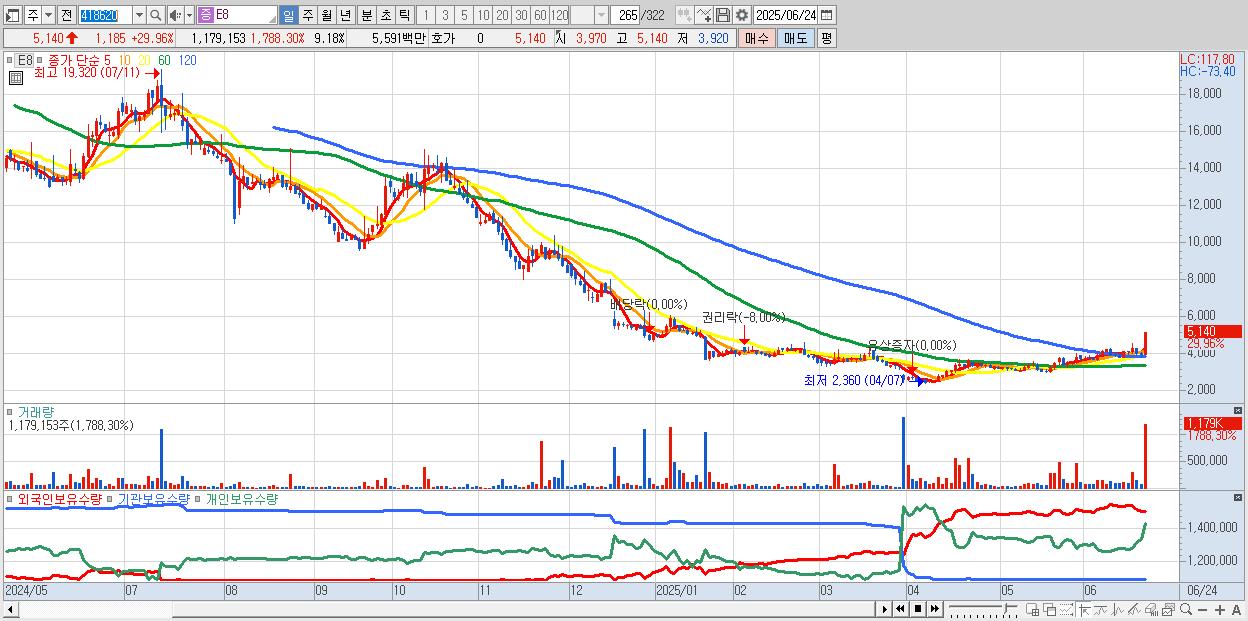 - E8 (5,140원 ▲ 29.96% , 시총: 661억, 거래량: 1,179,153, 거래대금:56억)