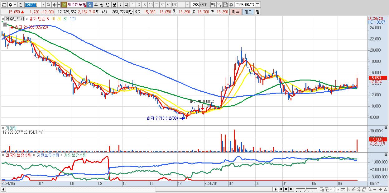 - 제주반도체 (15,050원 ▲ 12.9% , 시총: 5,184억, 거래량: 8,817,575, 거래대금:1,312억)
