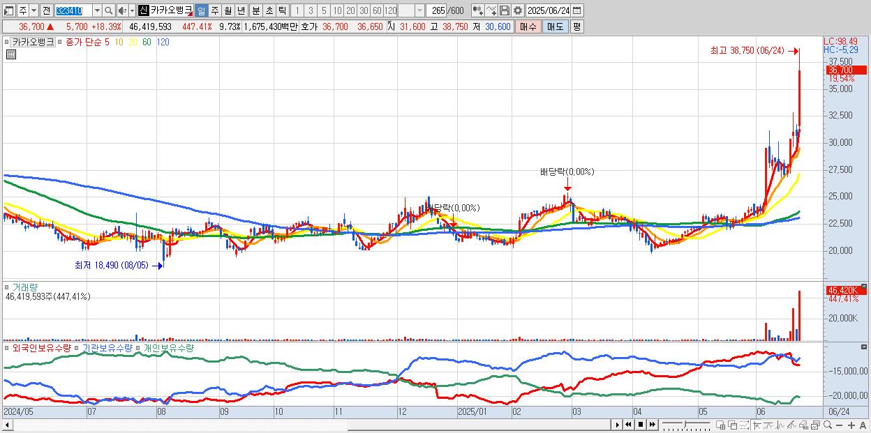 - 카카오뱅크 (37,000원 ▲ 19.35% , 시총: 176,486억, 거래량: 24,303,988, 거래대금:8,770억)