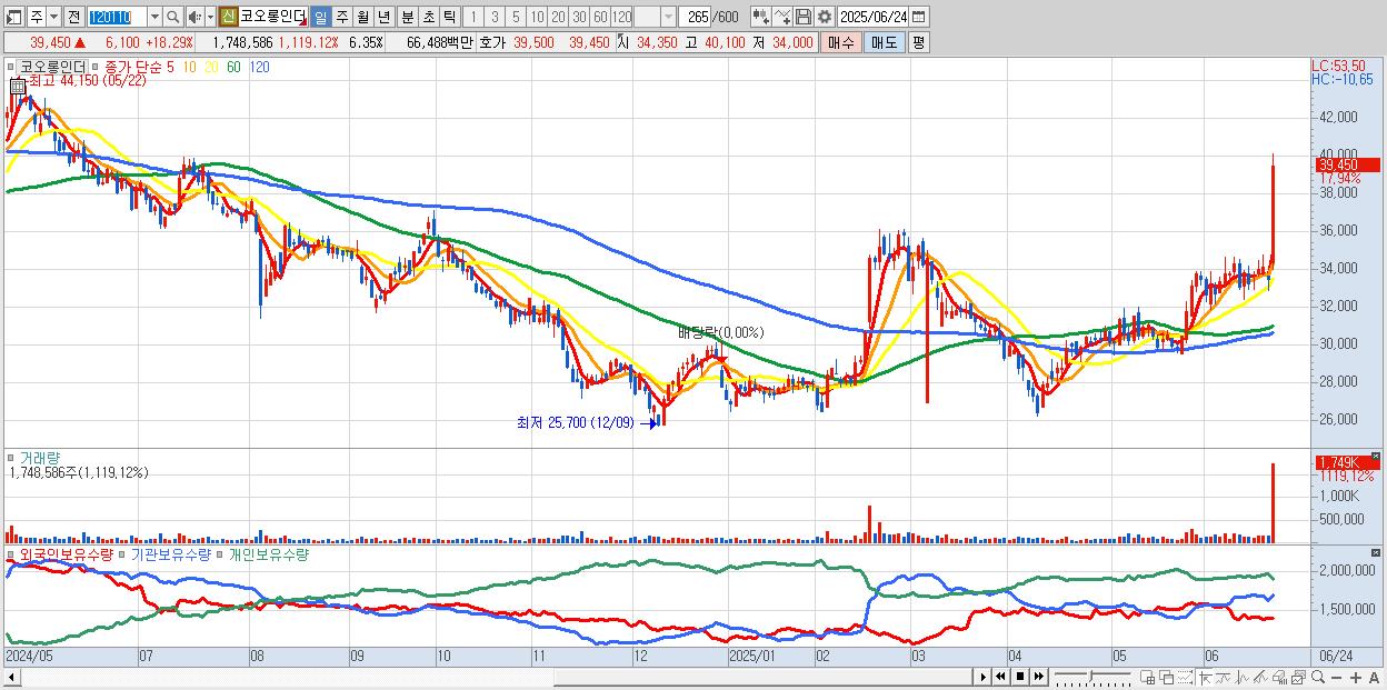 - 코오롱인더 (39,150원 ▲ 17.39% , 시총: 10,774억, 거래량: 1,057,331, 거래대금:402억)