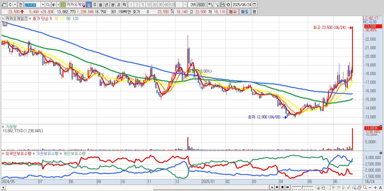 - 카카오게임즈 (23,500원 ▲ 29.83% , 시총: 19,474억, 거래량: 7,242,040, 거래대금:1,568억)