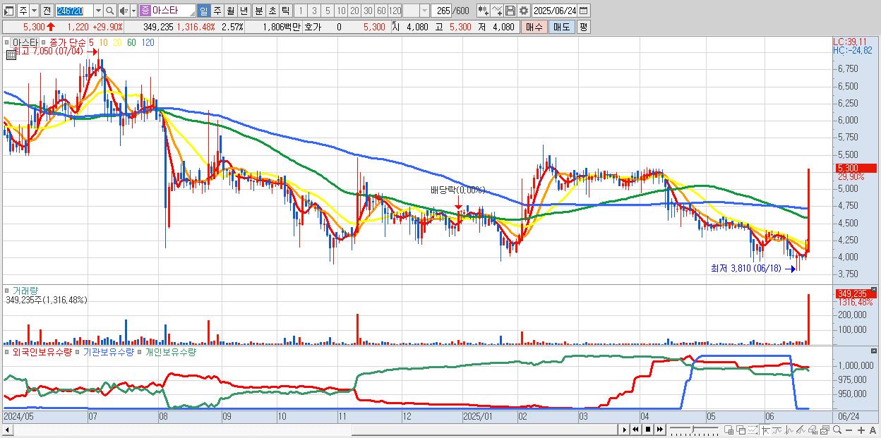 - 아스타 (5,300원 ▲ 29.9% , 시총: 719억, 거래량: 349,235, 거래대금:18억)