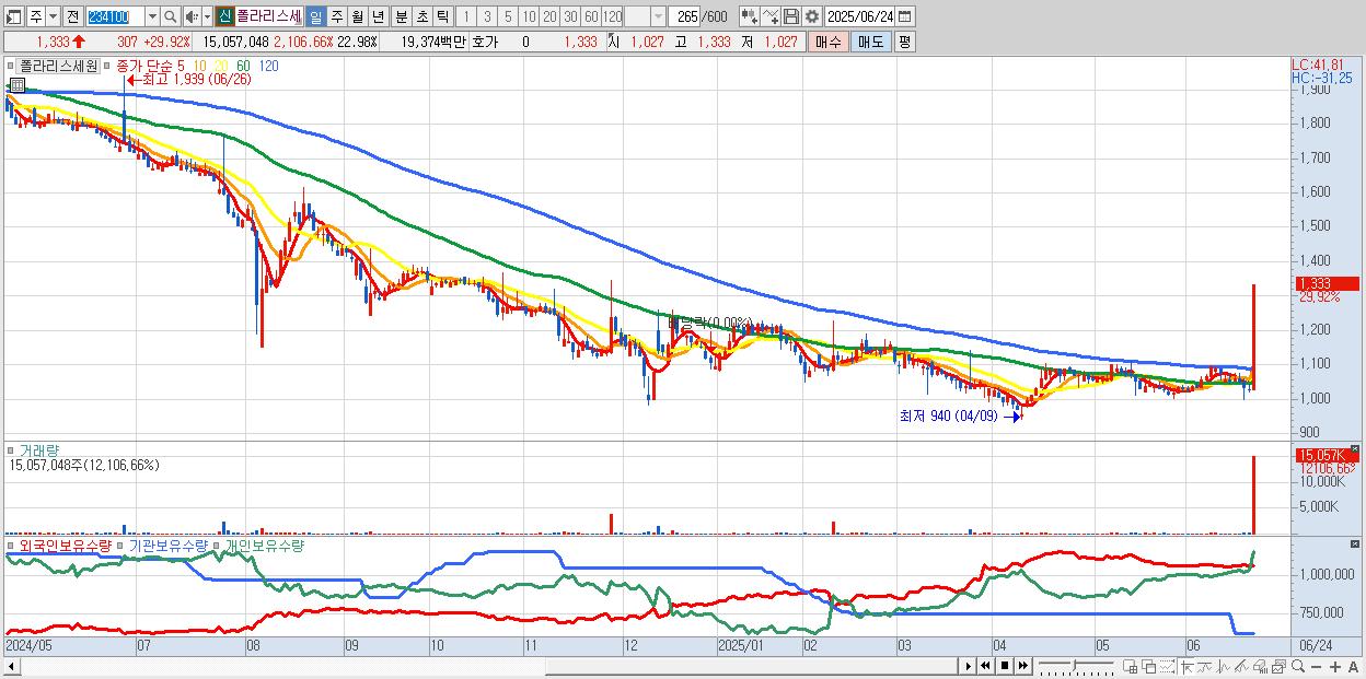 - 폴라리스세원 (1,333원 ▲ 29.92% , 시총: 873억, 거래량: 15,057,048, 거래대금:194억)