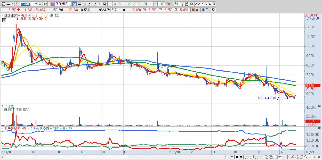 - 에이비온 (5,850원 ▲ 29.86% , 시총: 1,675억, 거래량: 159,391, 거래대금:9억)