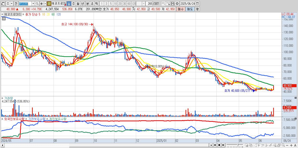 - 에코프로머티 (49,450원 ▲ 16.08% , 시총: 34,582억, 거래량: 2,450,113, 거래대금:1,165억)