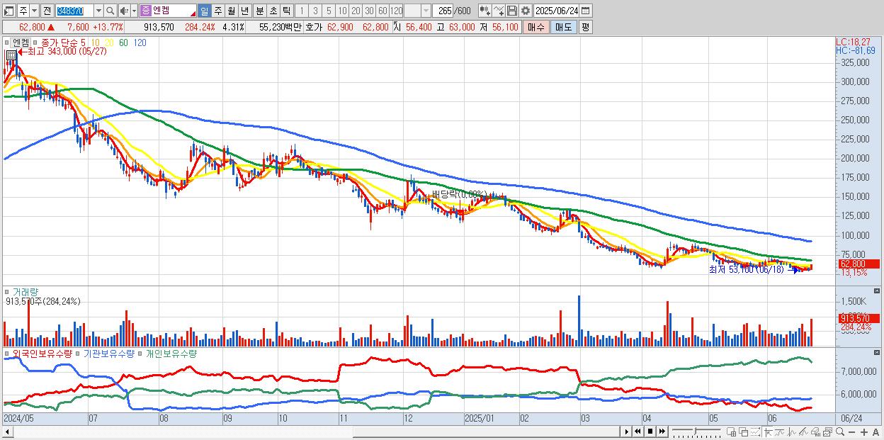 - 엔켐 (62,200원 ▲ 12.68% , 시총: 13,183억, 거래량: 508,400, 거래대금:308억)