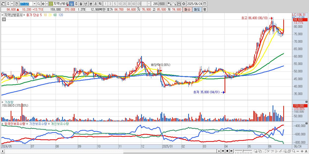 - 지역난방공사 (84,900원 ▲ 14.11% , 시총: 9,830억, 거래량: 131,394, 거래대금:107억)