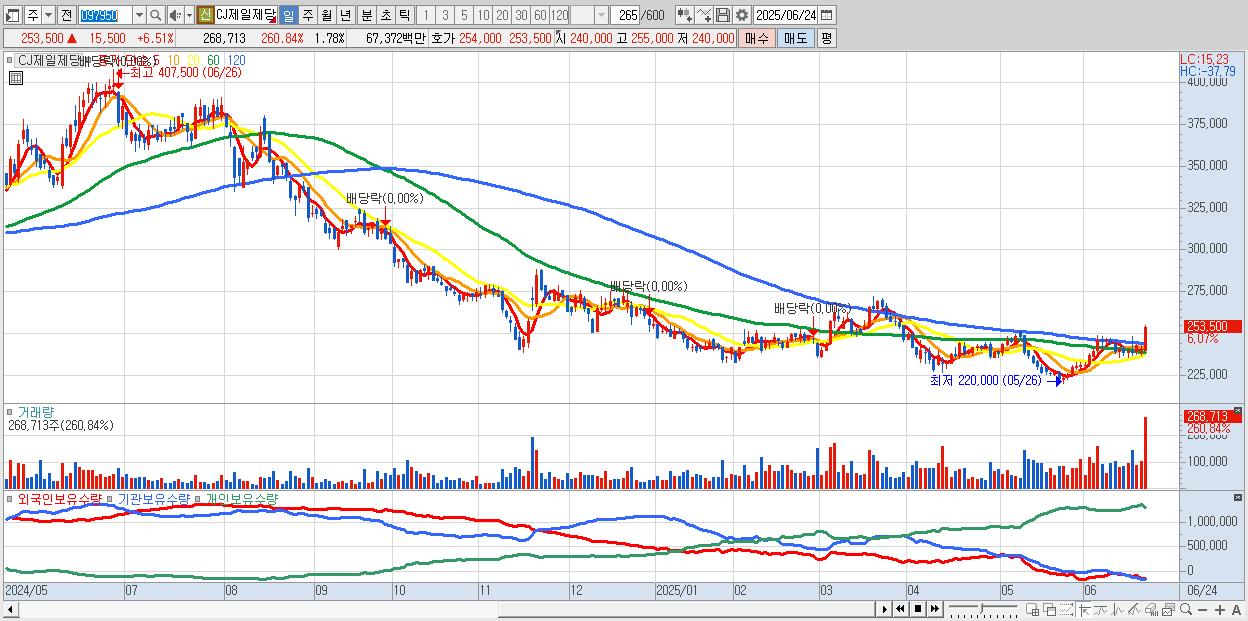 - CJ제일제당 (254,000원 ▲ 6.72% , 시총: 38,238억, 외국인 순매수 거래금:167억)