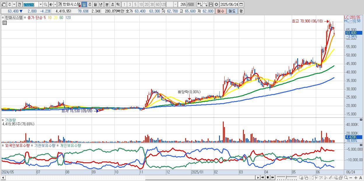 - 한화시스템 (63,100원 ▼ -4.68% , 시총: 119,208억, 외국인 순매수 거래금:147억)