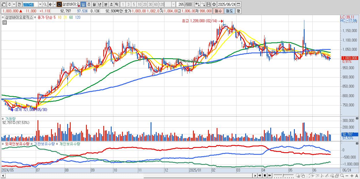 - 삼성바이오로직스 (1,004,000원 ▲ 1.21% , 시총: 714,587억, 외국인 순매수 거래금:131억)