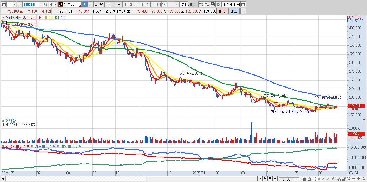 - 삼성SDI (176,800원 ▲ 4.43% , 시총: 142,475억, 외국인 순매수 거래금:261억)