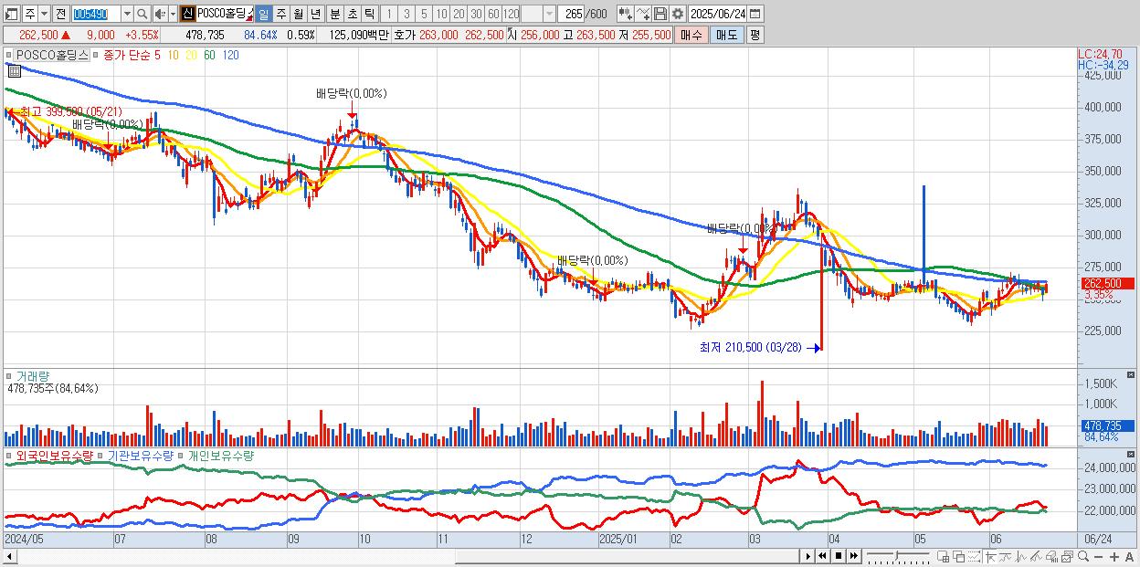 - POSCO홀딩스 (263,000원 ▲ 3.75% , 시총: 212,854억, 외국인 순매수 거래금:262억)