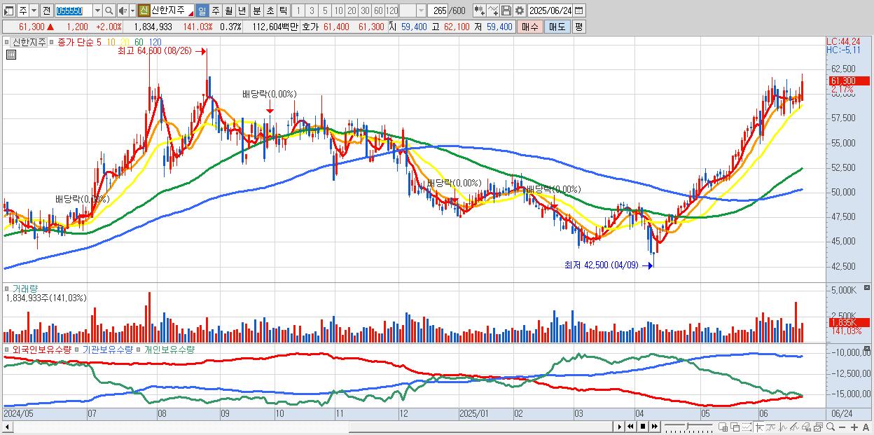 - 신한지주 (61,000원 ▲ 1.5% , 시총: 302,464억, 외국인 순매수 거래금:305억)