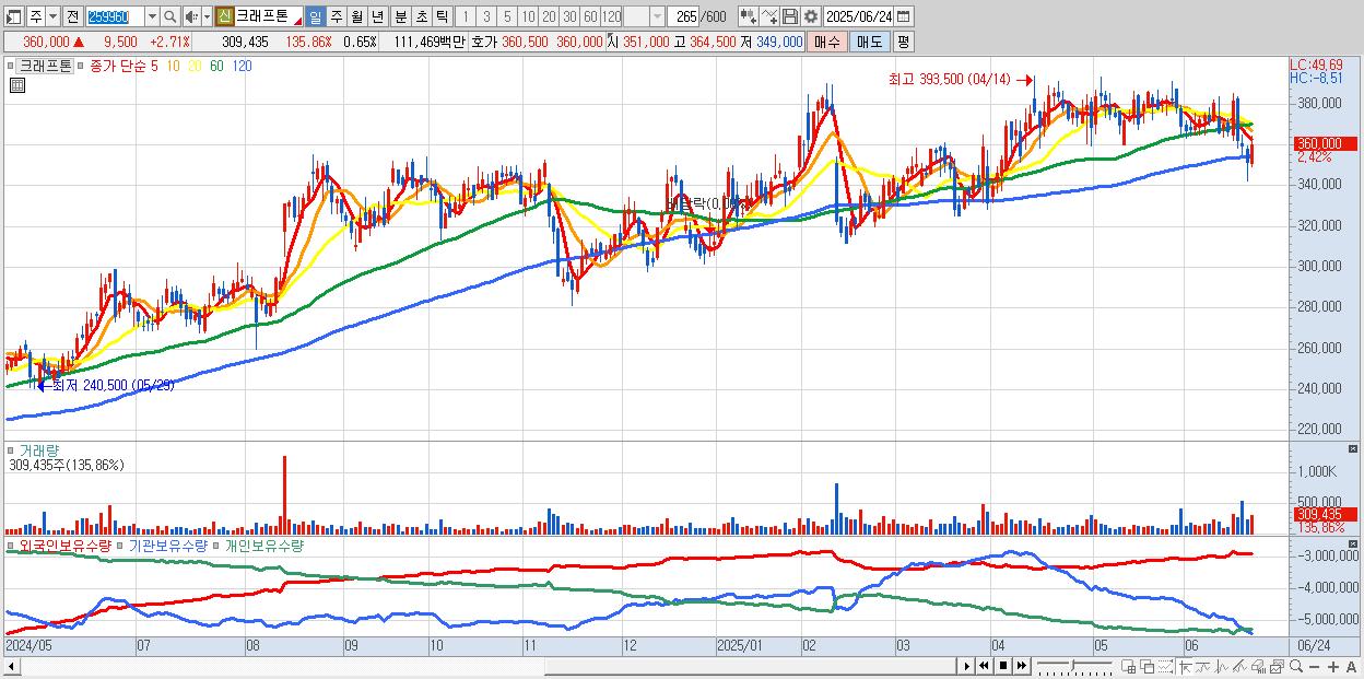 - 크래프톤 (361,500원 ▲ 3.14% , 시총: 171,310억, 외국인 순매수 거래금:142억)