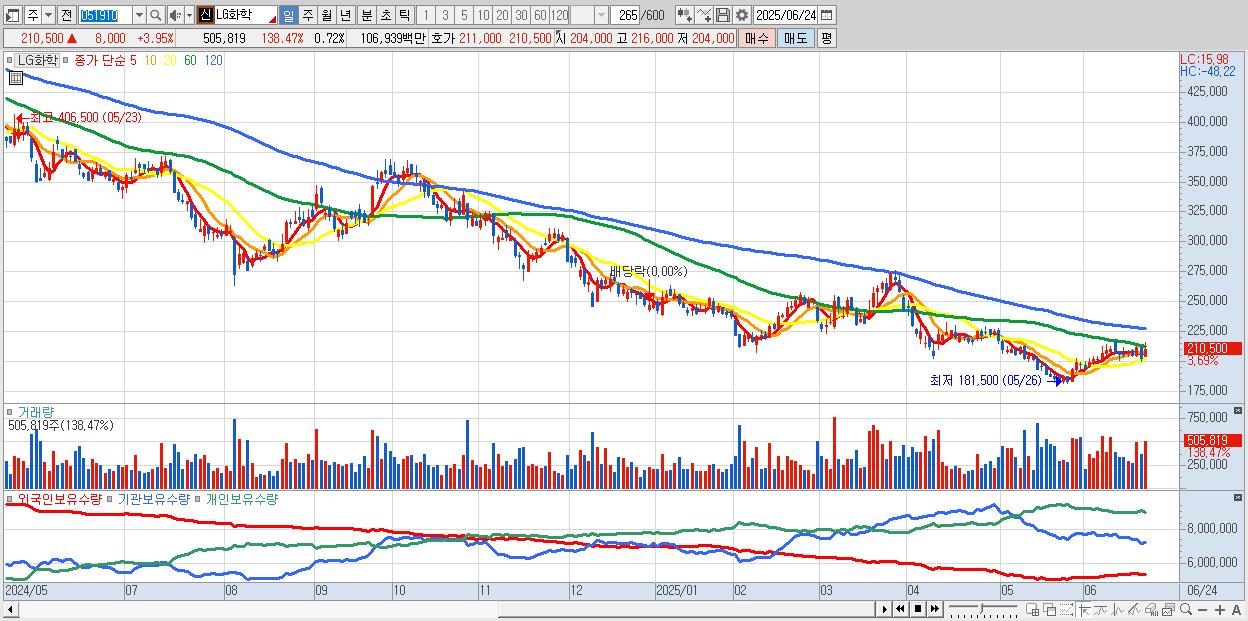 - LG화학 (211,000원 ▲ 4.2% , 시총: 148,950억, 외국인 순매수 거래금:211억)