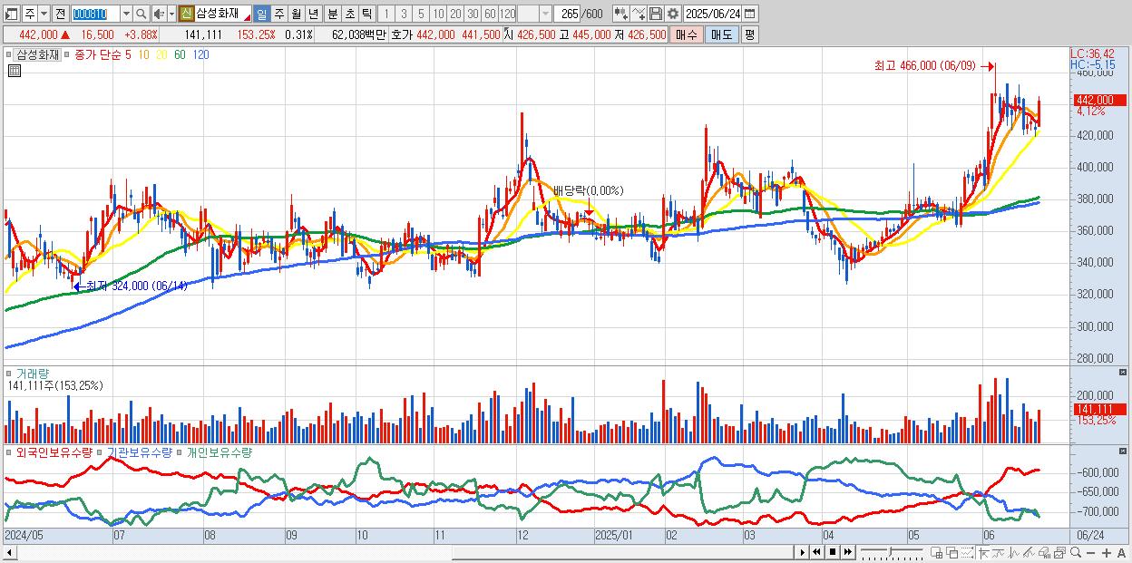 - 삼성화재 (444,000원 ▲ 4.35% , 시총: 204,290억, 외국인 순매수 거래금:131억)
