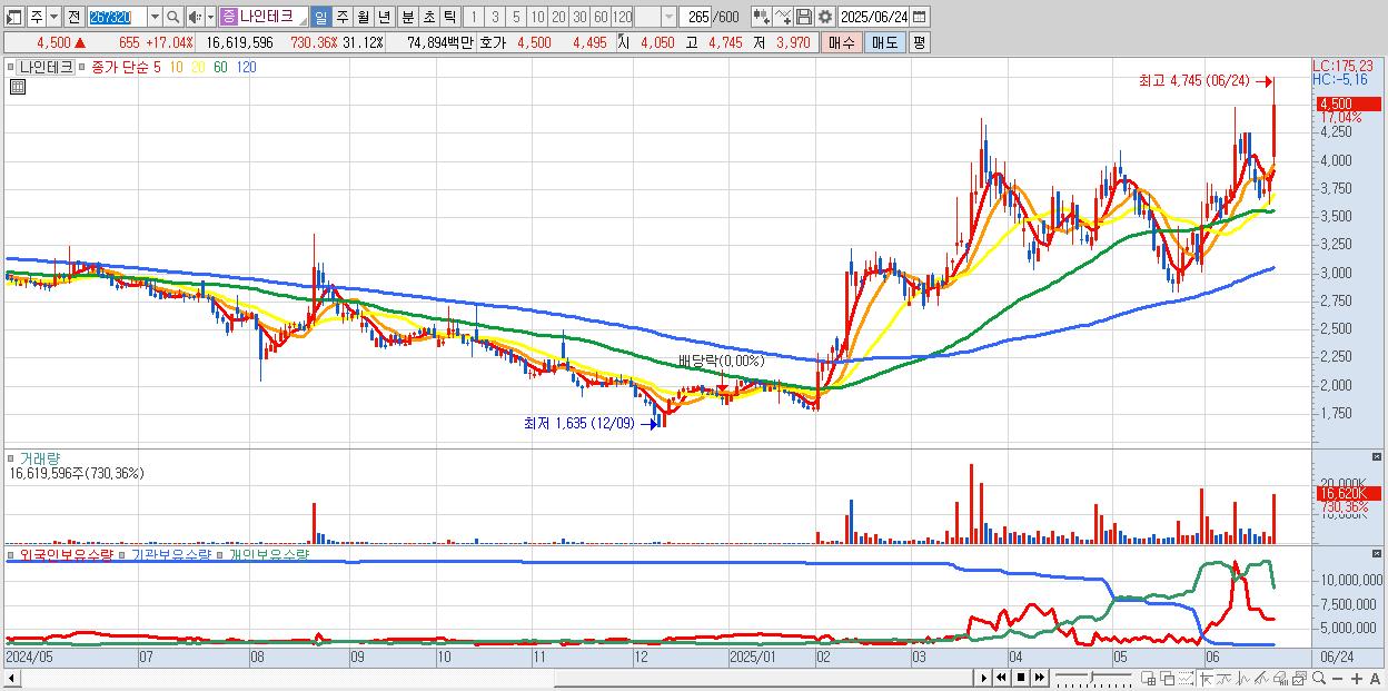 - 나인테크 (4,500원 ▲ 17.04% , 시총: 2,403억, 거래량: 16,619,596, 거래대금:749억, KOSDAQ)