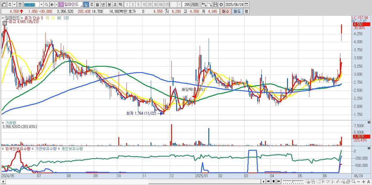 - 딥마인드 (4,550원 ▲ 30% , 시총: 1,039억, 거래량: 3,356,520, 거래대금:150억, KOSDAQ)